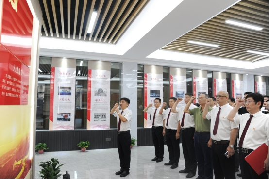 在热烈的掌声中,设计院全体支部委员为党史学习教育专题展进行了揭牌。随后,设计院党支部书记、董事长胡迎新带领全体党员重温入党誓词。